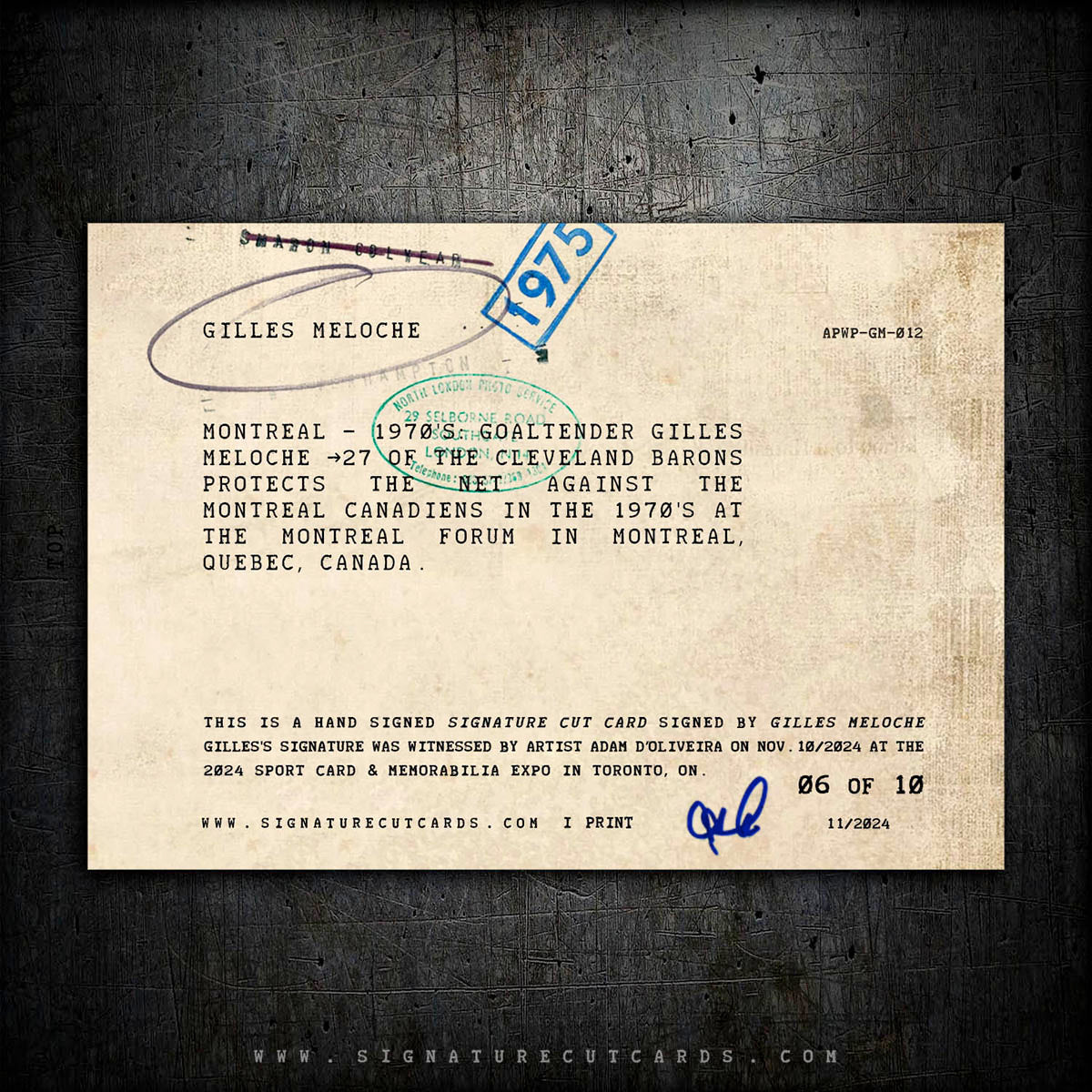 This is an autographed Gilles Meloche Cleveland Barons AP Wirephoto card. Handcrafted & hard-signed.