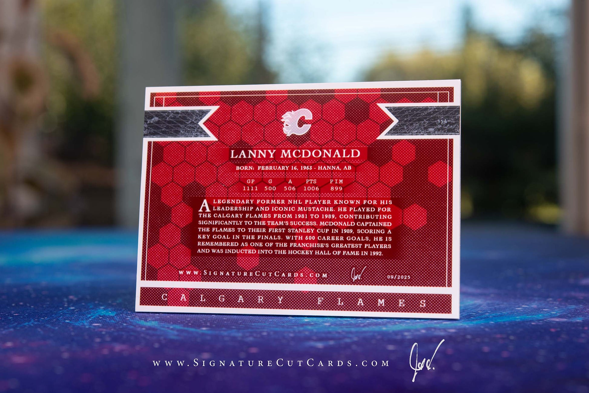 This is a custom-made Calgary Flames Signature Cut Card of Lanny McDonald.