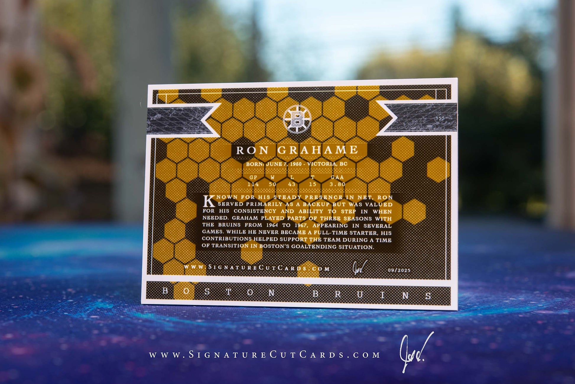 This is a custom-made Boston Bruins Signature Cut Card of Ron Grahame.