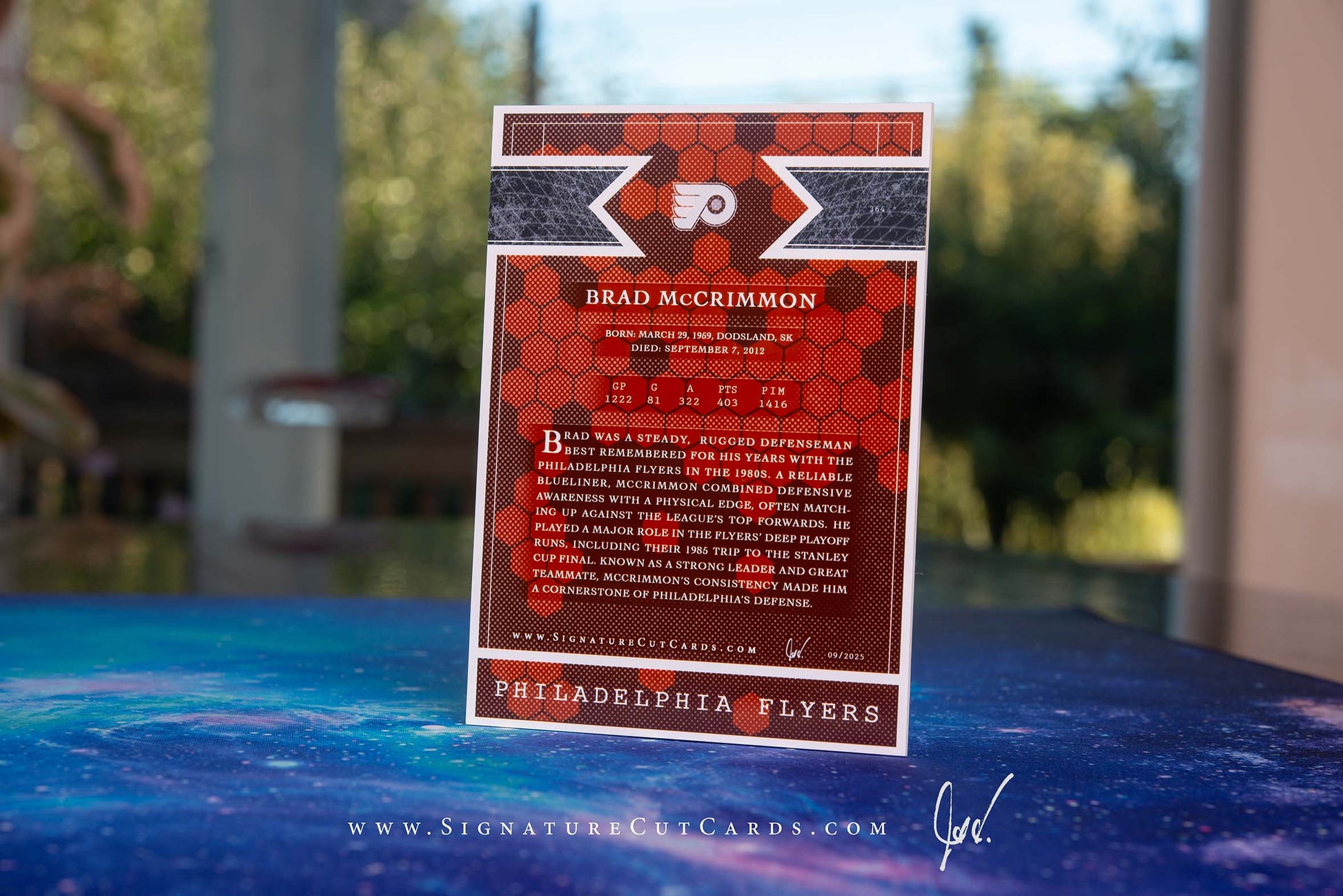 This is a custom-made Philadelphia Flyers Signature Cut Card of Brad McCrimmon.