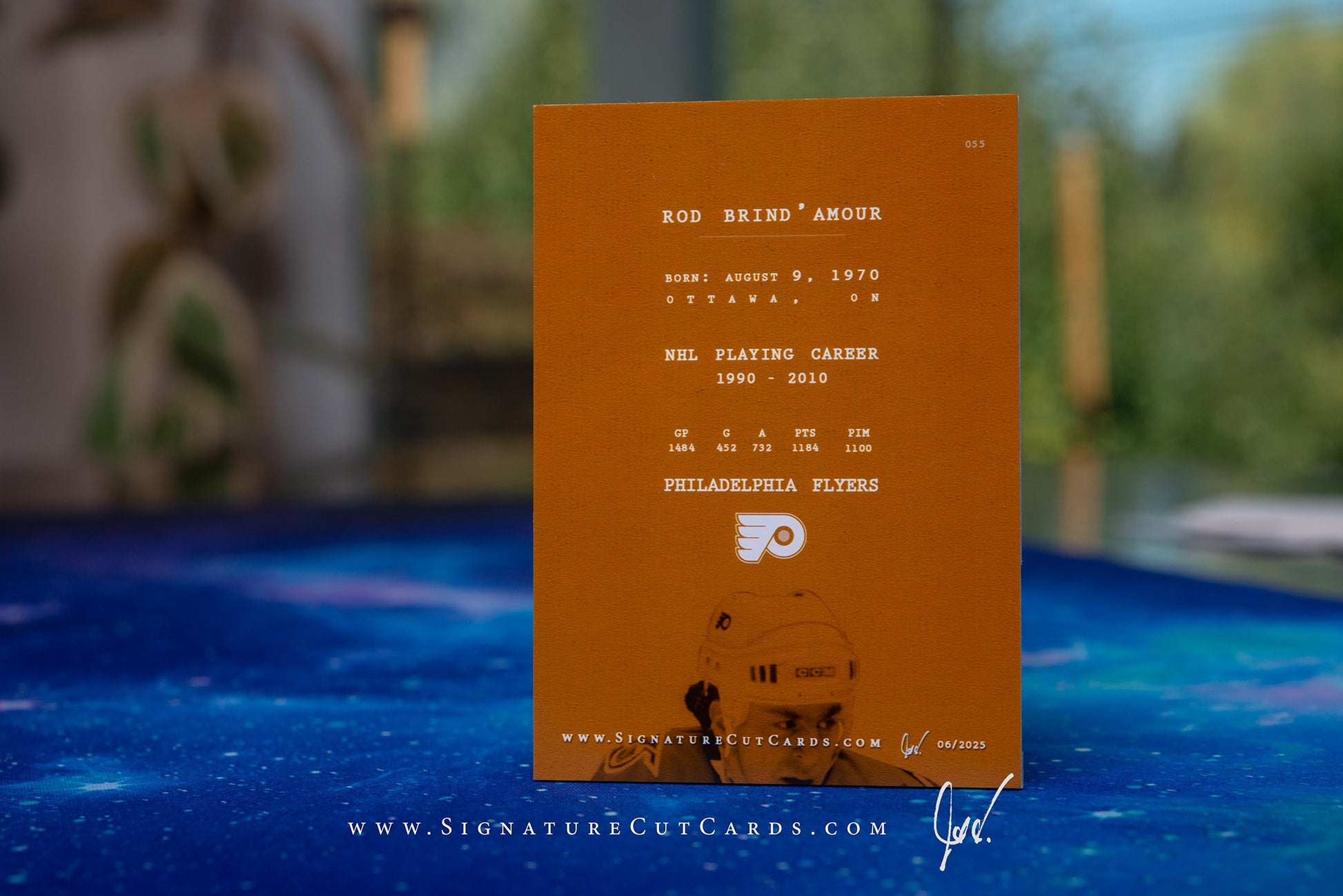 This is a custom-made Philadelphia Flyers Signature Cut Card of Rod Brind'Amour.